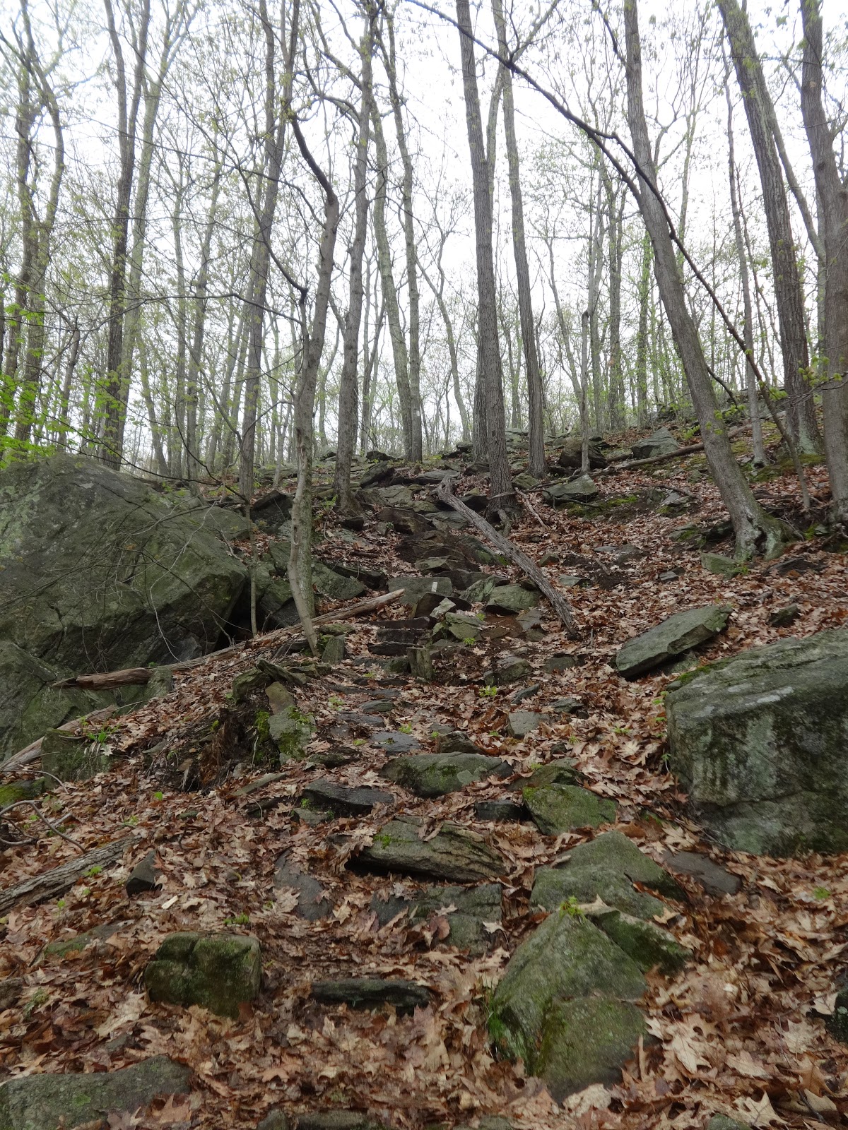 We started out hiking at 8:30 after staging our vehicle at West Cornwall Road and riding down to Skiff Mountain Road to start. Highlights of the day were Caleb's Peak then St John's Ledges--boulder climbing going up and rock steps going down. Our first barefoot stream crossing was at Guinea Brook. A posted note told us that the stepping stones were no longer safe and advised us to use the detour route. Instead, we took off our boots and socks and waded through. It was cold but not dangerous.